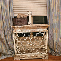 Beautiful, recycled pine glass-front cabinet with honeycomb details